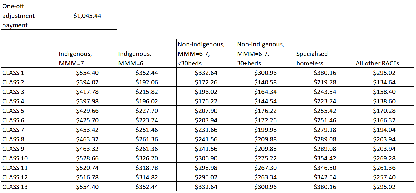 By applying our algorithm across all residents in our dataset (89,000+ beds) we see the industry AN-ACC classification distribution. Combined with the known weighting of each classification (i.e. Class 1 and 13 = 149% of NWAU, Class 2 = 68% of NWAU etc. [assuming the facility is ‘All other RACFs]) we can then calculate the value of NWAU based on current Average Daily Subsidy (ADS).